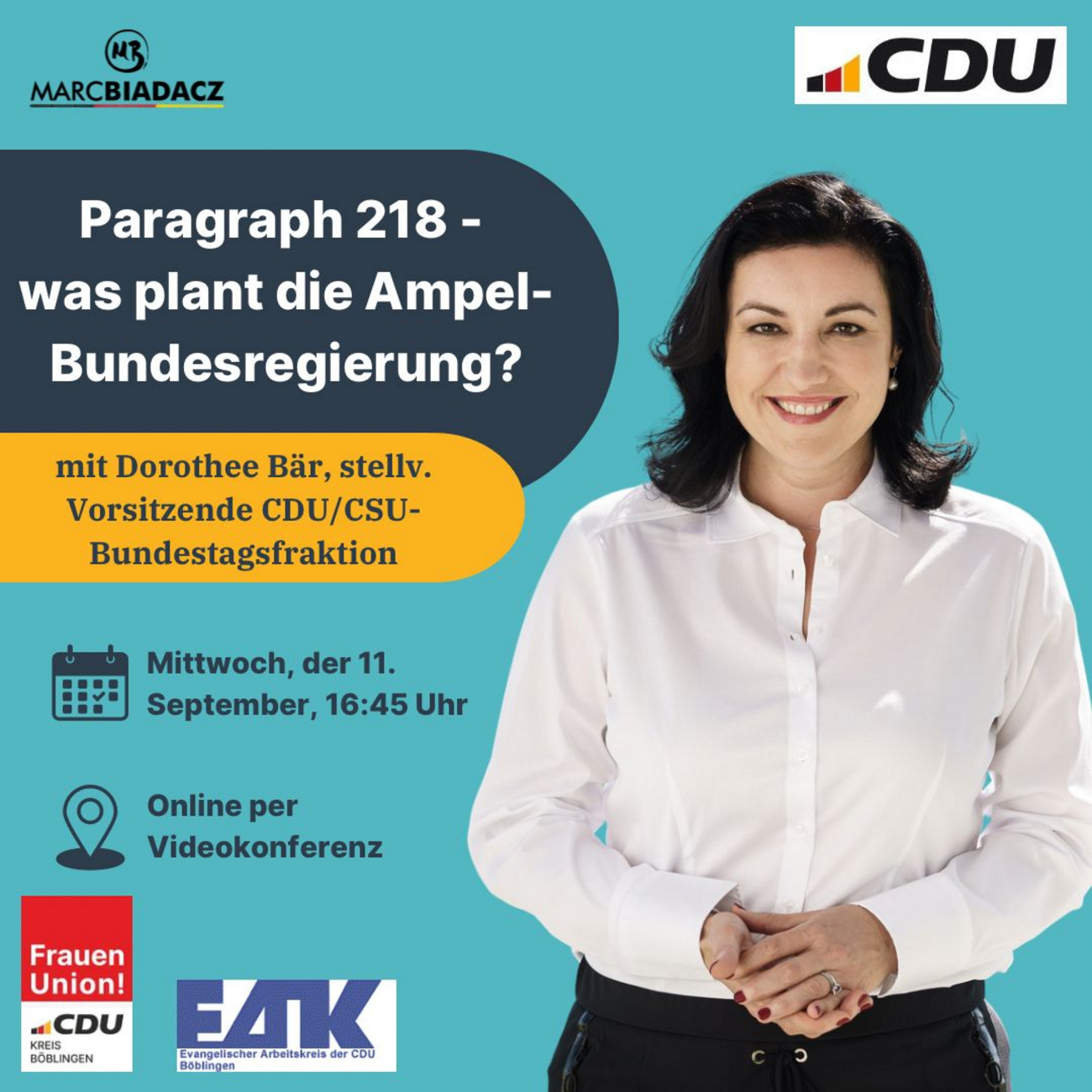 "Ich freue mich sehr, dass Dorothee Bär unserer Einladung gefolgt ist. Gemeinsam mit ihr wollen wir der Frage nachgehen, was nun genau die Pläne der Ampel-Bundesregierung sind. Alle Interessierten sind herzlich eingeladen, sich an der Diskussion zu beteiligen. Uns ist es wichtig, das Angebot zur Teilnahme möglichst vielen Menschen zu machen, weil es sich um ein elementares Thema unseres gesellschaftlichen Zusammenlebens handelt.", so Marc Biadacz, direkt gewählter Bundestagsabgeordneter für den Landkreis Böblingen.