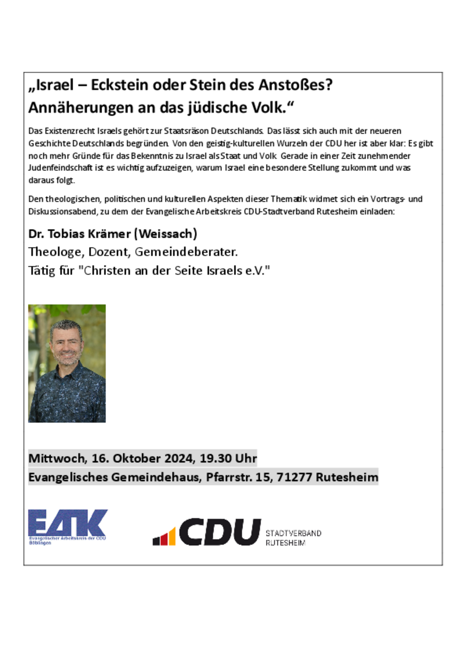 Das Existenzrecht Israels gehört zur Staatsräson Deutschlands. Das lässt sich auch mit der neueren Geschichte Deutschlands begründen. Von den geistig-kulturellen Wurzeln der CDU her ist aber klar: Es gibt noch mehr Gründe für das Bekenntnis zu Israel als Staat und Volk. Gerade in einer Zeit zunehmender Judenfeindschaft ist es wichtig aufzuzeigen, warum Israel eine besondere Stellung zukommt und was daraus folgt. Den theologischen, politischen und kulturellen Aspekten dieser Thematik widmet sich ein Vortrags- und Diskussionsabend, zu dem der Evangelische Arbeitskreis CDU-Stadtverband Rutesheim einladen: Dr. Tobias Krämer (Weissach) Theologe, Dozent, Gemeindeberater. Tätig für "Christen an der Seite Israels e.V."